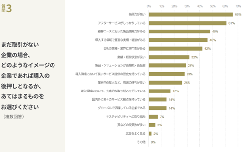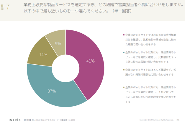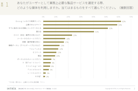 製造業界に関する調査結果によると、多くの方が必要なサービスを探す際にWebを活用していることが分かりました。また、約8割の方がWeb上で得た情報をもとに候補を絞り込んだ後、営業担当に問い合わせをしているという結果も示されています。機械設計事務所を選ぶ際も同様の傾向で検討が行われていると推察できます。