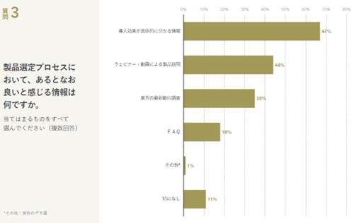 これらの基本情報に加え、「導入事例」や「導入効果が具体的に分かる情報」も多くの顧客が求めています。具体的には、どのような課題に対して、どのような技術やサービスがどのような効果をもたらしたのかを示すことで、顧客にとっての価値をわかりやすく伝えることが重要です。